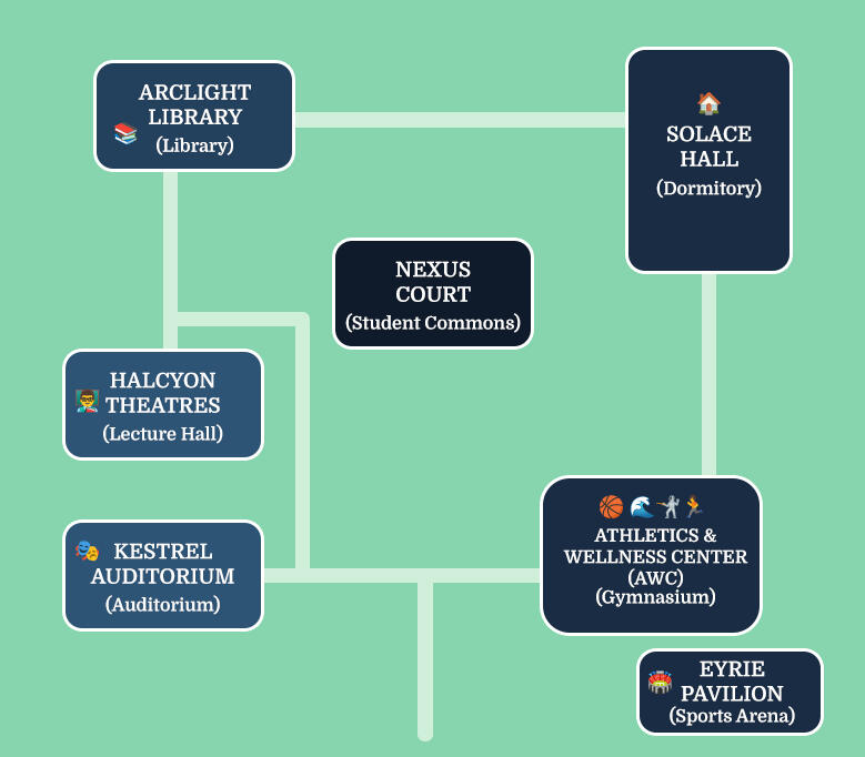 Keywords: eirendon university, campus, arclight library, halcyon theatres, lecture halls, solace hall, dorm suites, scholarship dorms, rooftop garden, nexus court, food hall, student lounge, amphitheater, athletics wellness center, AWC, Kestrel Auditorium, Eyrie